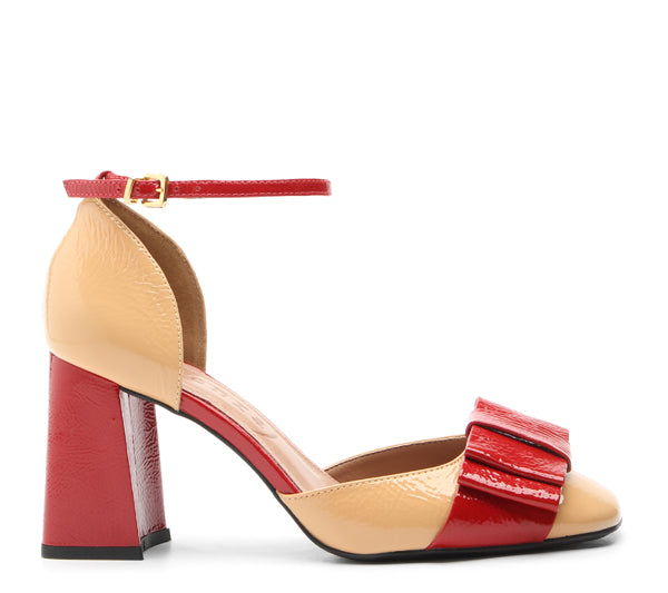 Modern and romantic. In red and beige varnish with a maxi bow on the front.