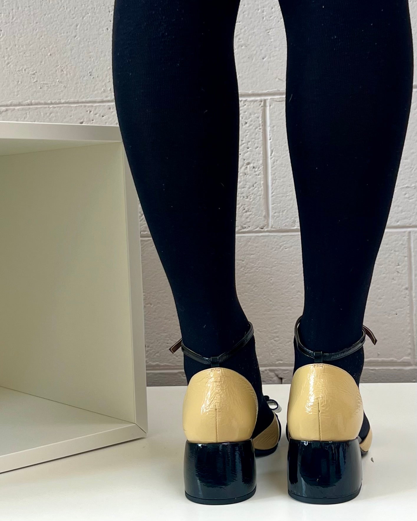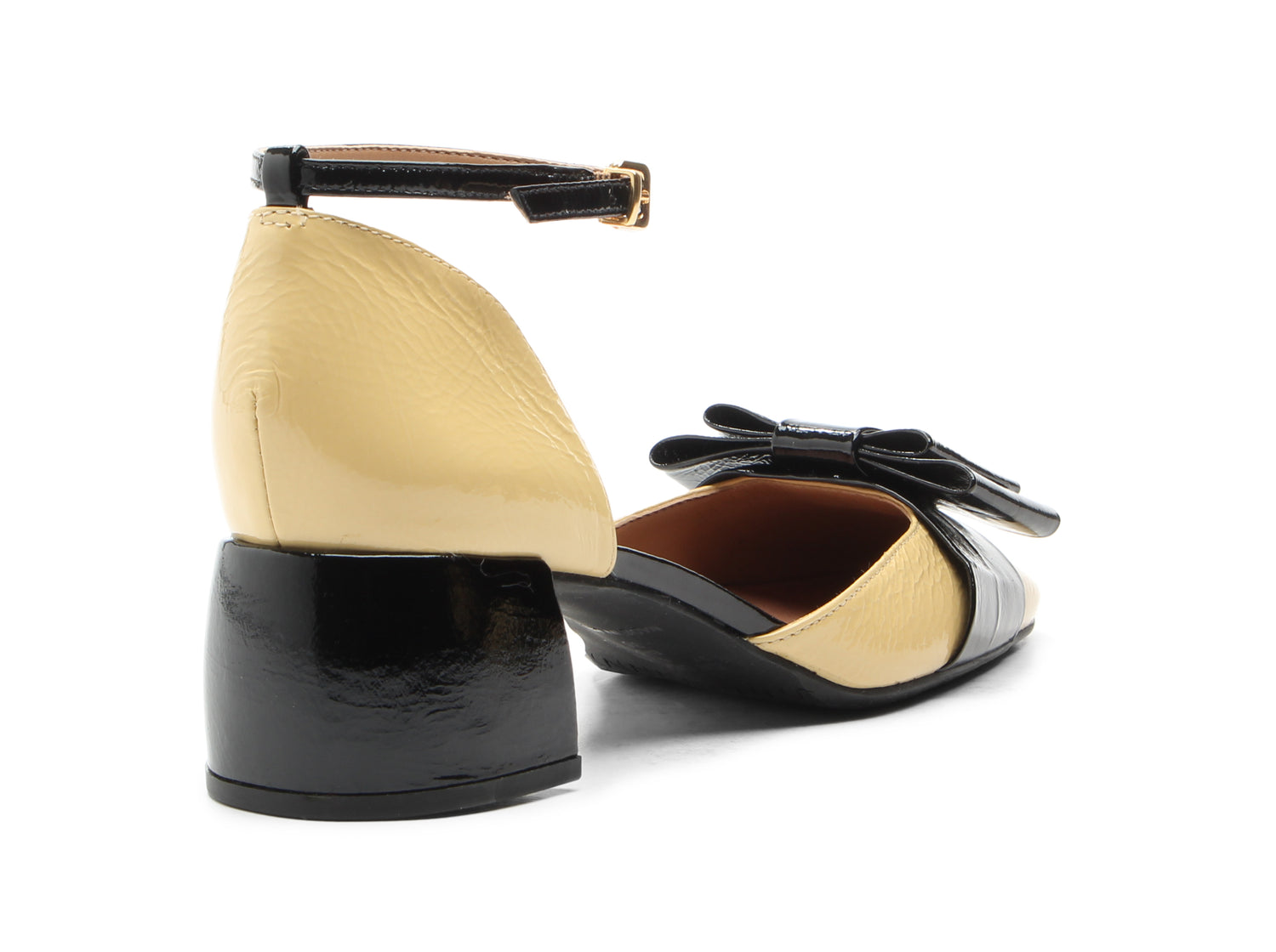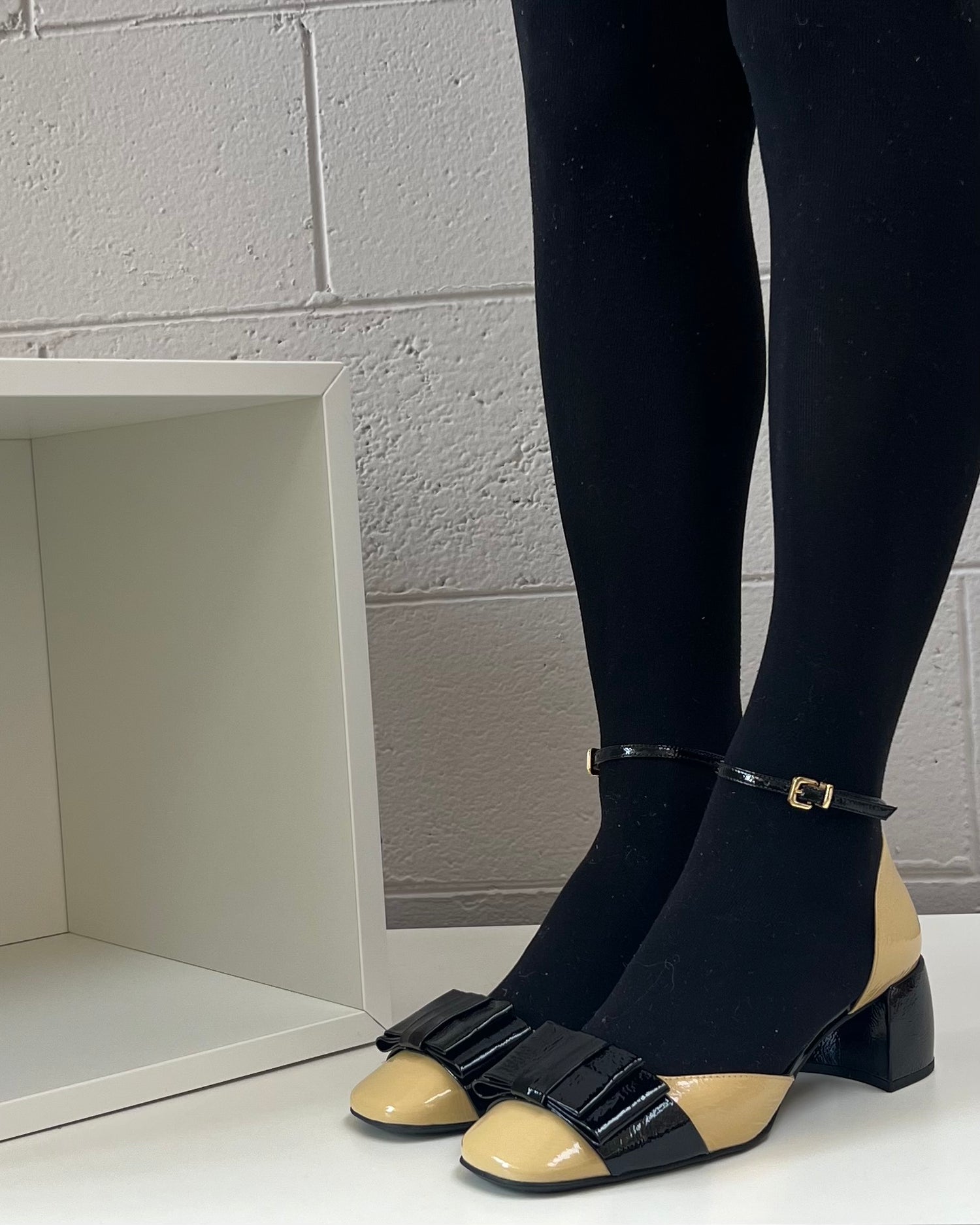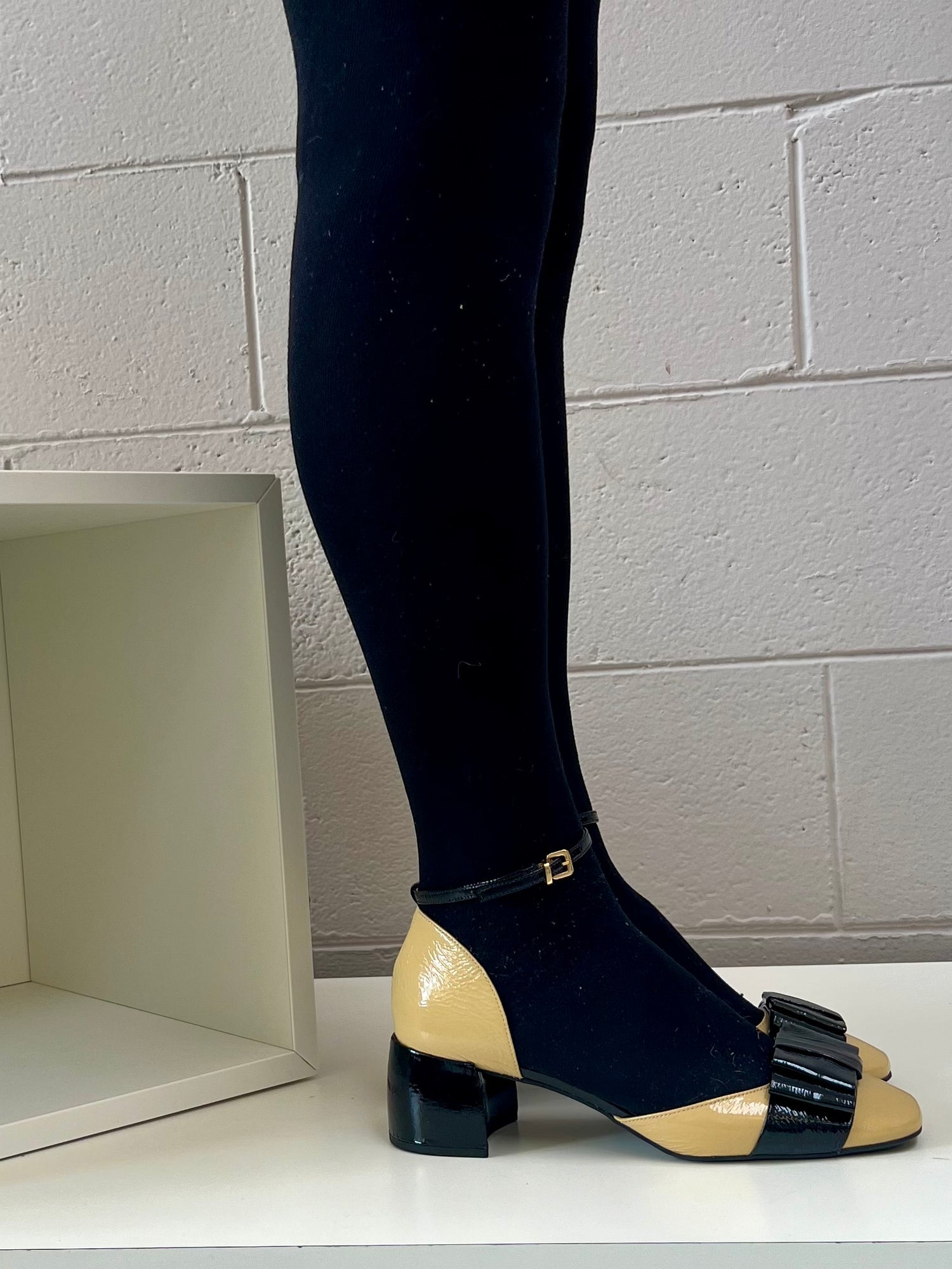 Leather upper. Almond toe. Leather covered heel (height 55 mm). Rubber sole.