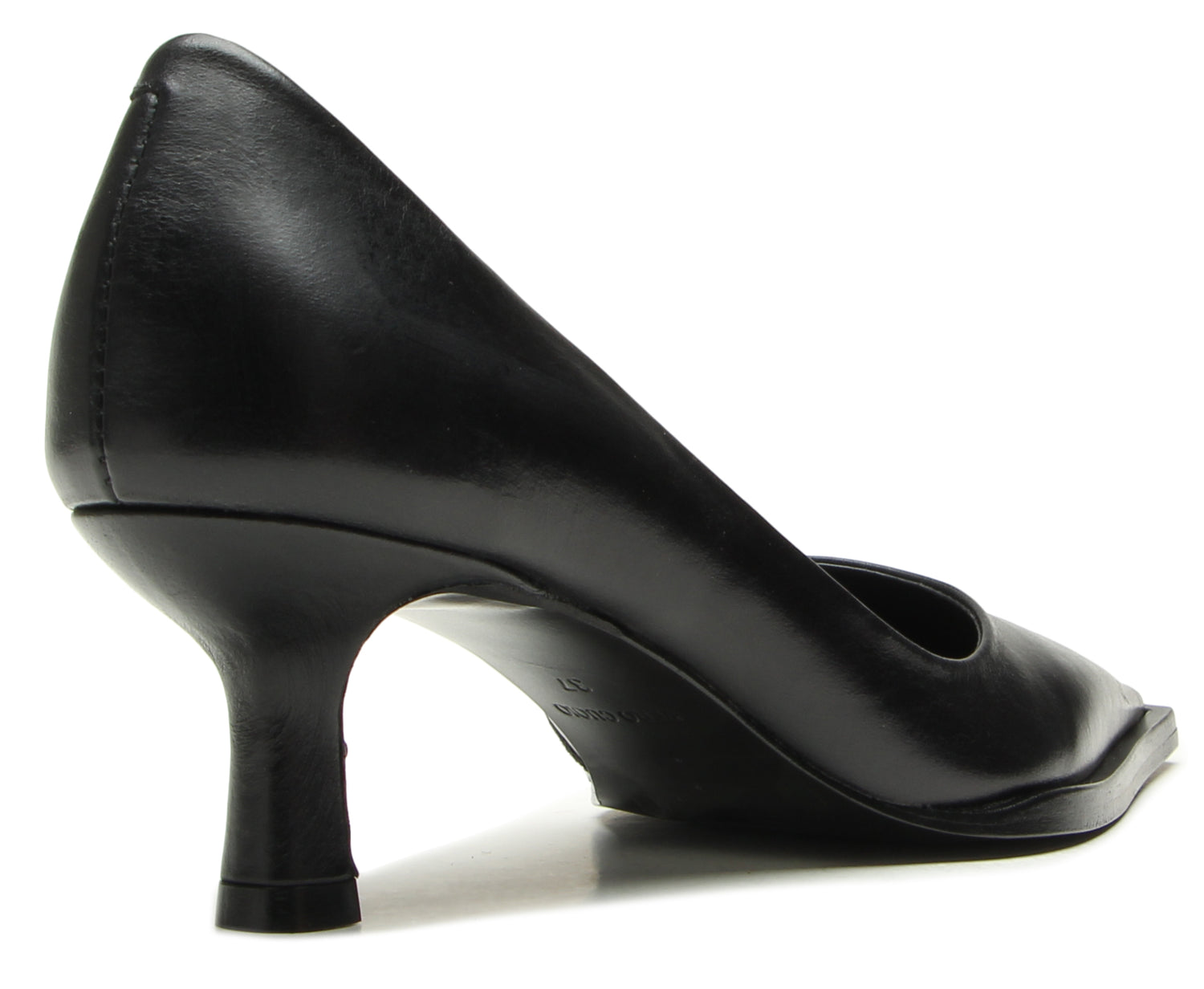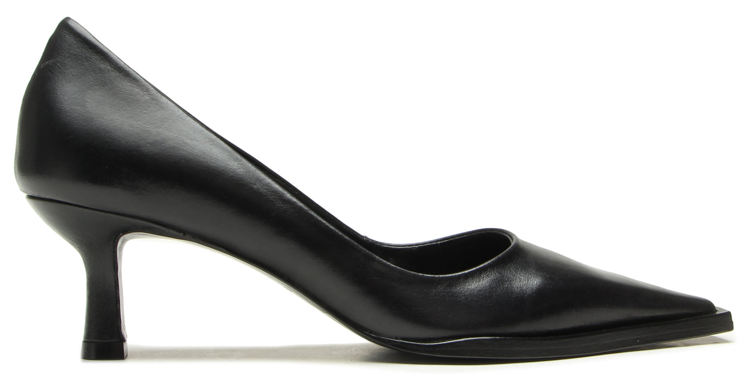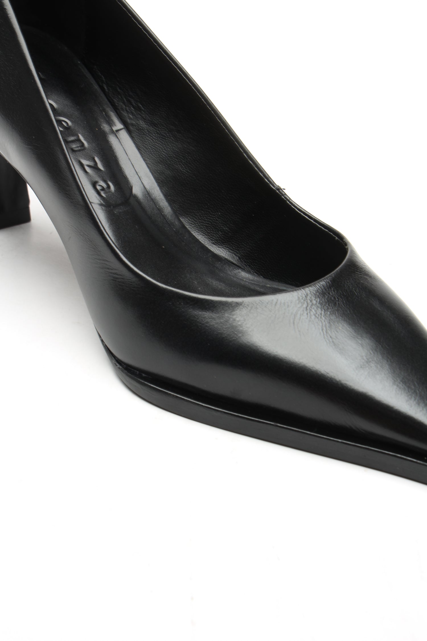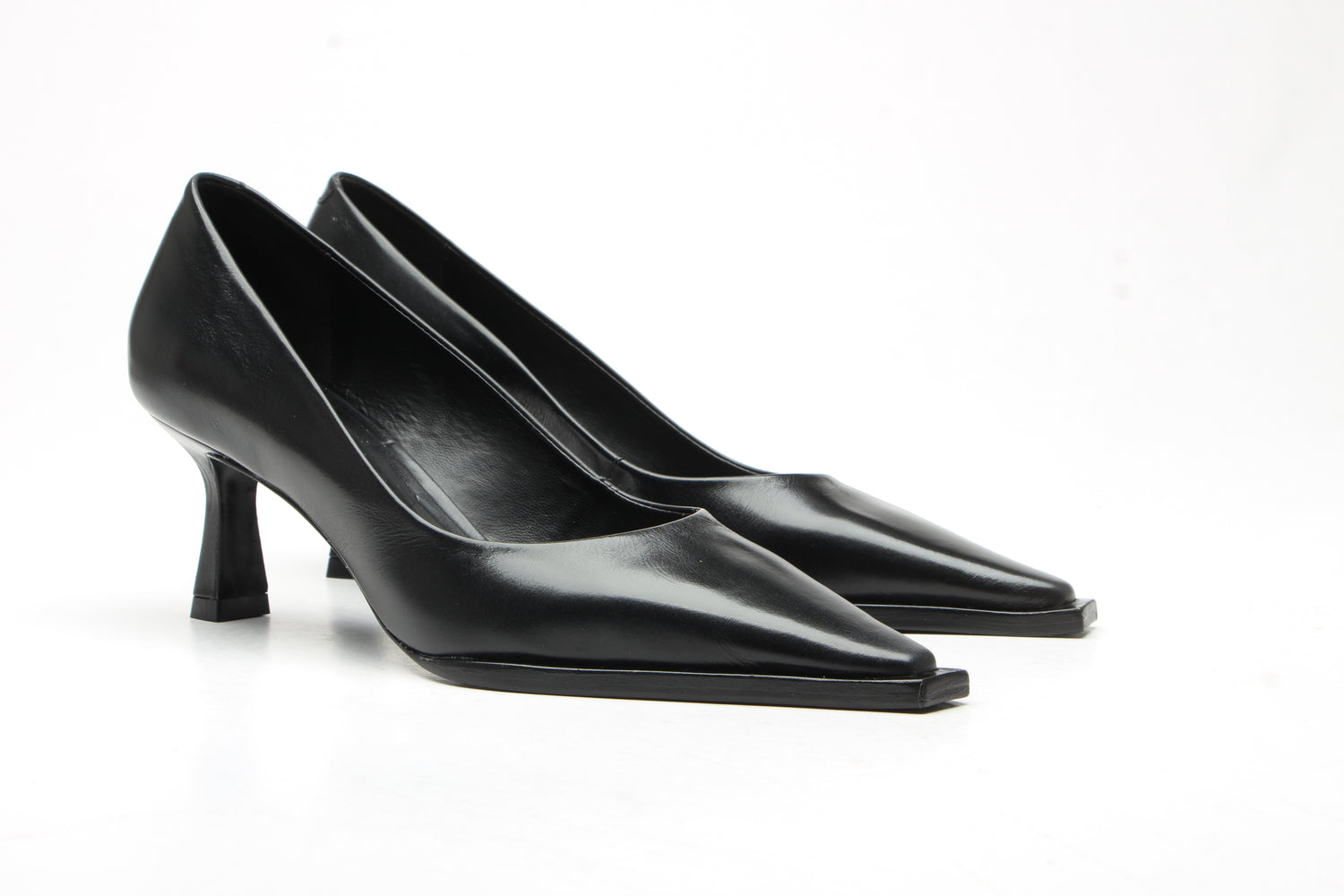 Tomaia pelle. Forma a punta. Tacco fasciato pelle (5 cm). Suola cuoio.