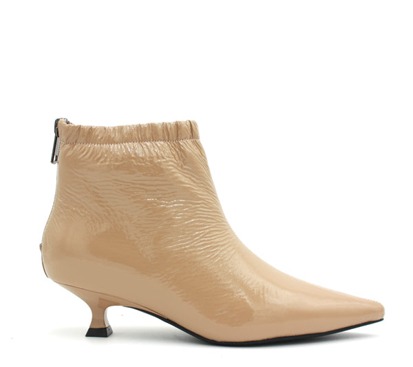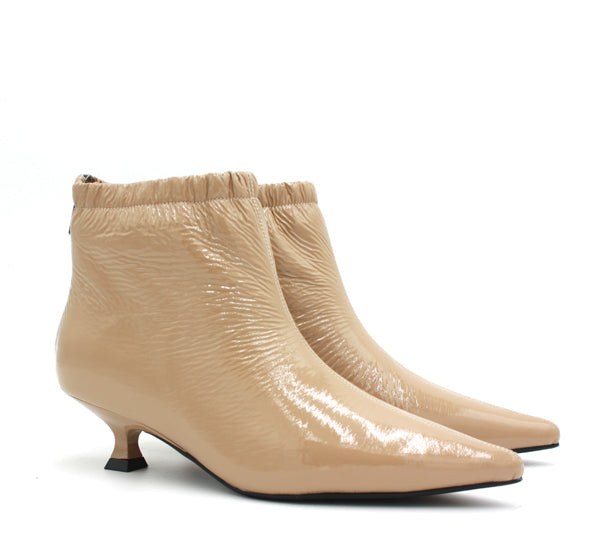 Un tronchetto morbidissimo. In vernice, arricciato alla caviglia. Zip sul retro.