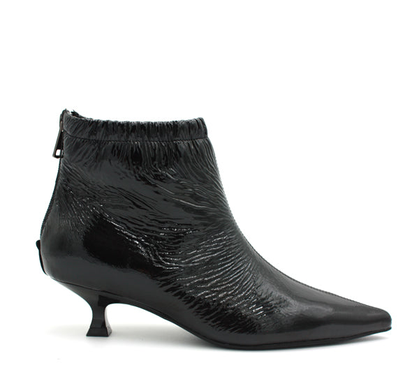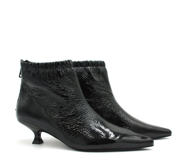 Un tronchetto morbidissimo. In vernice, arricciato alla caviglia. Zip sul retro.