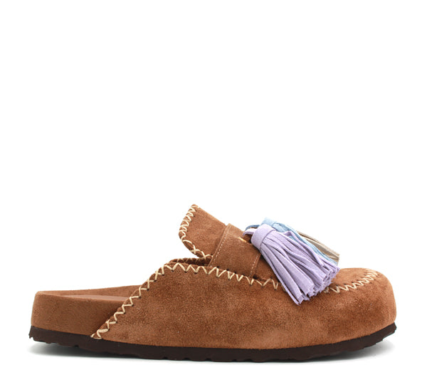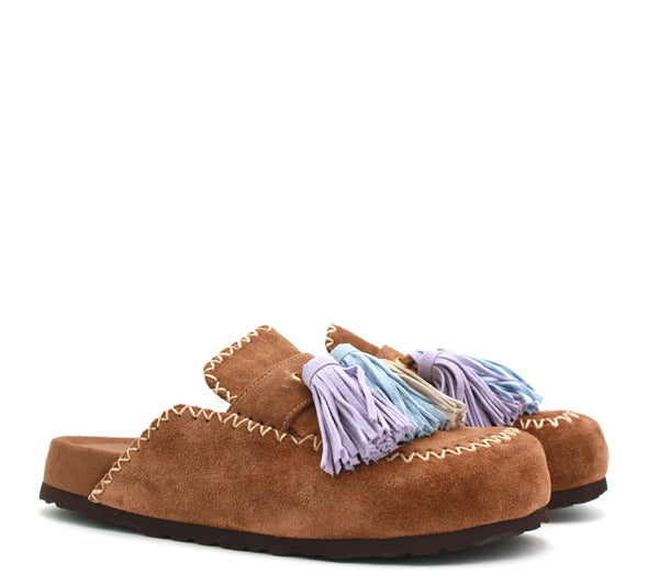 Una mule allegra e divertente. In camoscio color sigaro con nappine colorate.