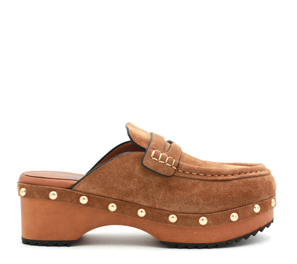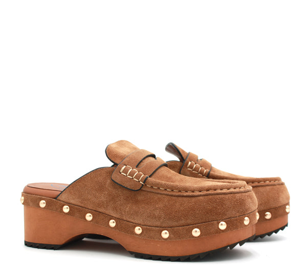 Tomaia in camoscio con dettagli borchie e fibbia dorati. Sottopiede ultra soft.